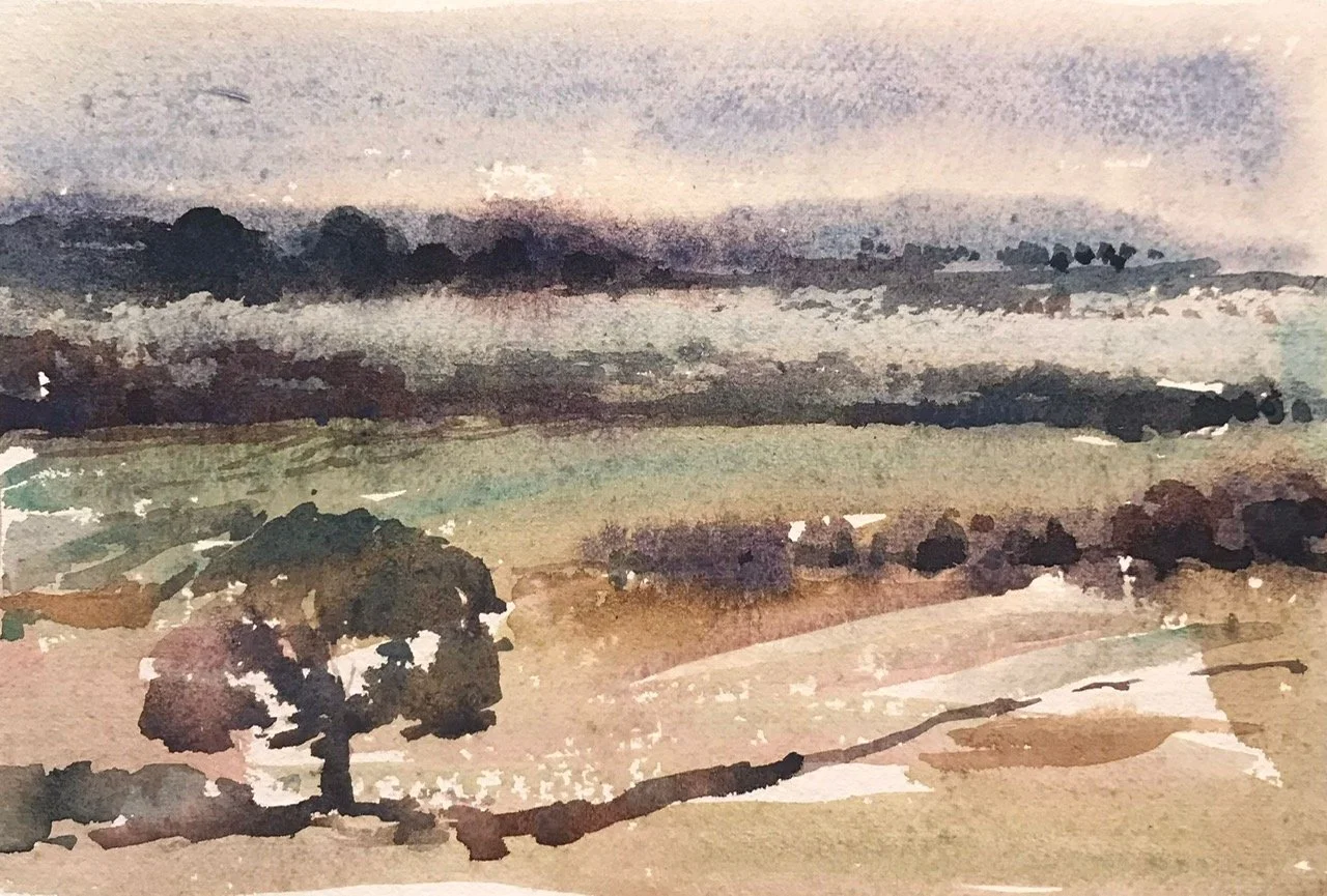 During the pandemic my work has revolved around the act of breathing in connection with the watercolour painting gesture in evoking landscape from memory. Looking at this work makes me feel grateful for light, earth, air and nostalgic of an unspeakable love.